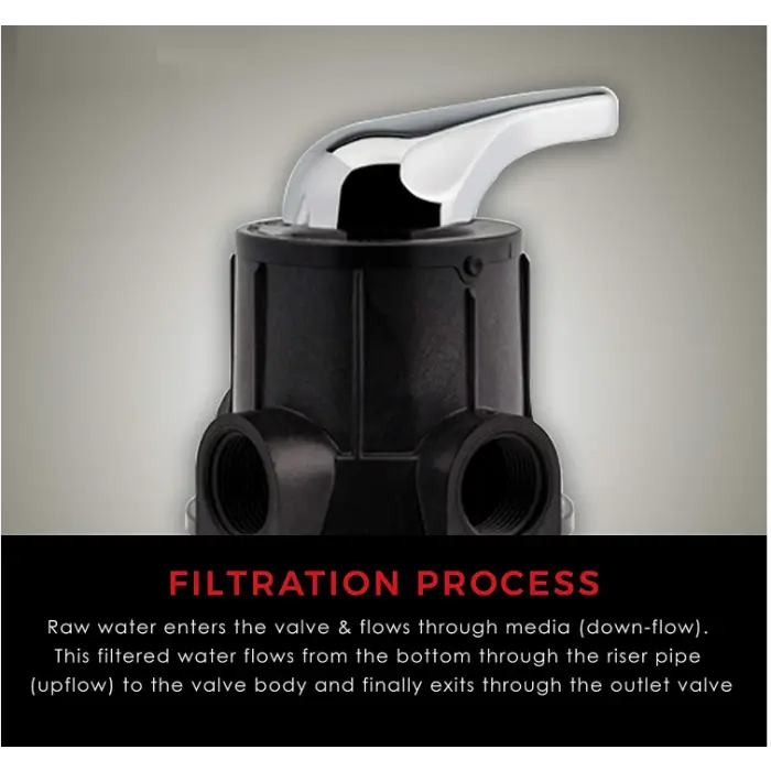 Manual Backwash Valve: The backwash process simply forces water rapidly through the system in reverse direction, lifting the media and flushing accumulated particulates down the drain. It also prevents the media from solidifying and reducing efficiency.